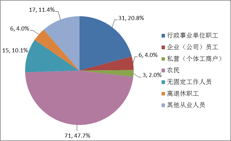从调查对象从业结构看,农民占47.7%,行政事业单位职工占20.8%,企业(公司)员工占4.0%,离退休职工占4.0%,私营(个体工商户)业主占2.0%,无固定工作单位务工人员占10.1%,其他从业人员占11.4%,如图1所示: