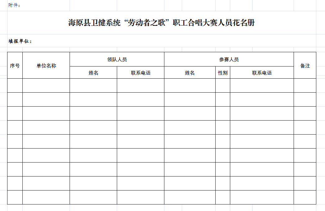 三、请各有关单位尽快确定参赛人员,并填报海原县卫健系统“劳动者之歌”职工合唱大赛人员花名册,于4月8日前报海原县卫健局系统工会办公室。