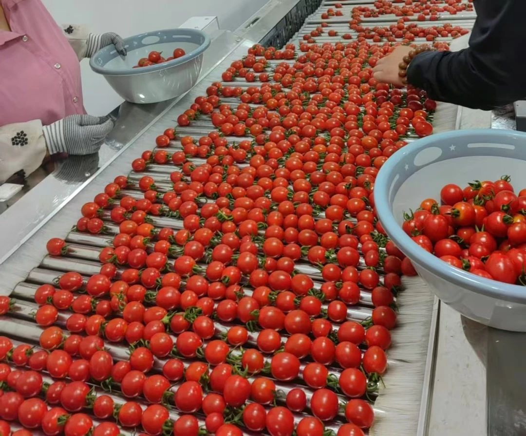 眼下,在海原县关桥乡关桥村的日光大棚里,一个个圆润饱满、鲜红透亮的小番茄挂满枝头,工人们熟练地将成熟的小番茄轻轻摘下,放进筐里。在基地另一边,烈日炎炎的夏日,工人们对采收回来的小番茄进行分拣、再继续装箱,分工井然有序。现场一片繁忙的景象。