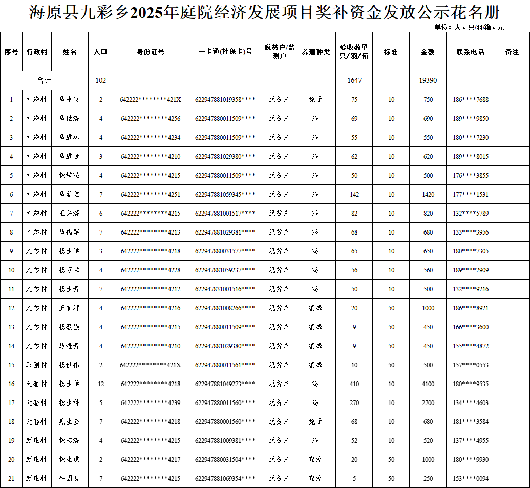海原县九彩乡2025年庭院经济发展项目奖补资金发放公示花名册