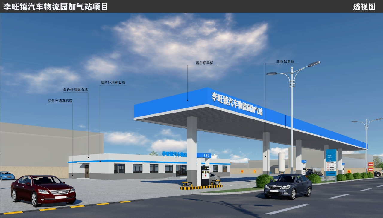 李旺镇汽车物流园加气站项目位于海原县李旺镇团庄村(李旺镇汽车物流园东侧),建设内容为建设加气站房一座611.15㎡,加气棚建筑面积284.4㎡(投影面积568.8㎡),围墙215米,加气岛三座,LNG储罐及加气设备一套,场地硬化和充电车位八个。