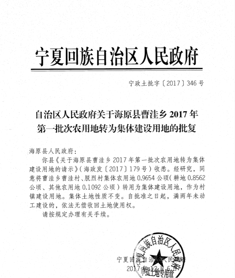 自治区人民政府关于海原县曹洼乡2017年第一批次农用地转为集体建设用地的批复