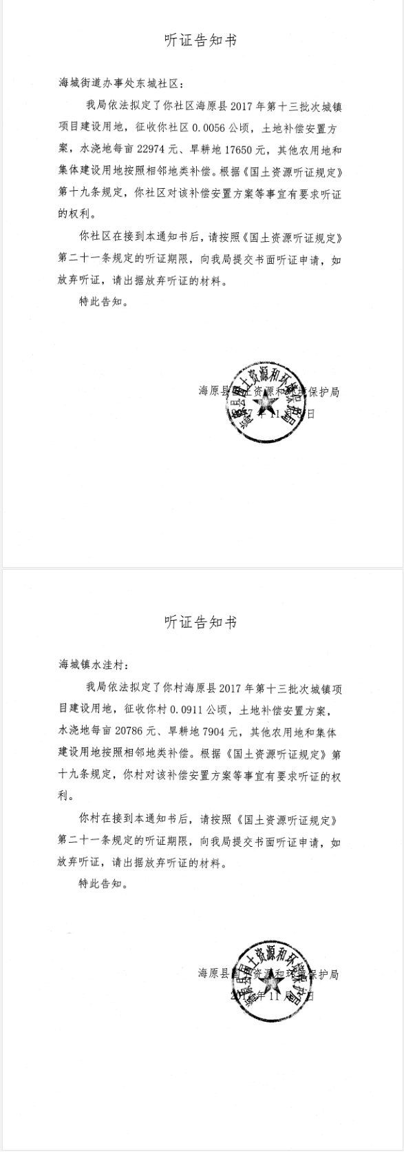 海原县2017年第十三批次城镇建设用地听证告知书