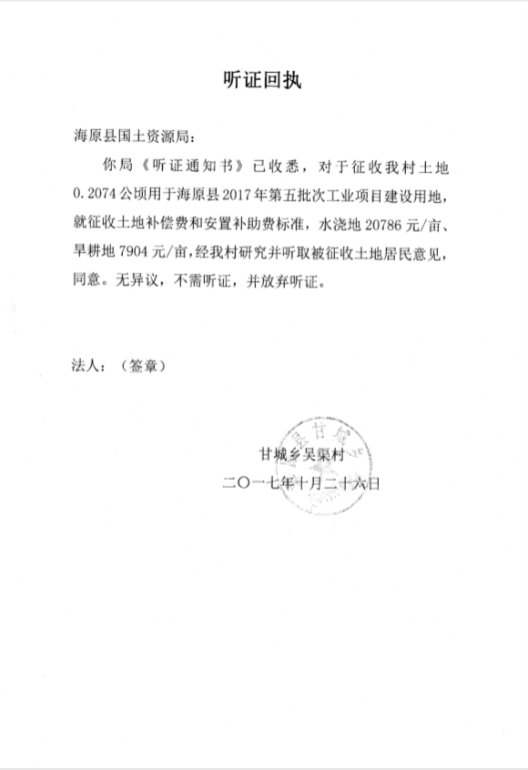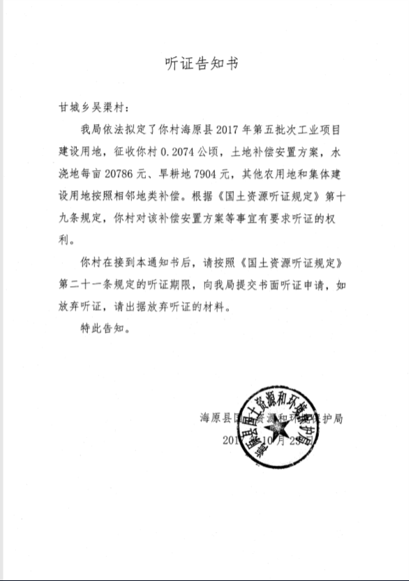 海原县2017年第五批次工业项目建设用地听证告知书、听证回执