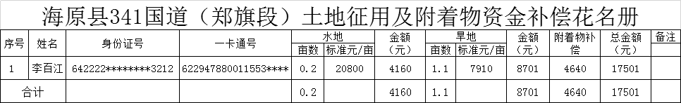 海原县341国道(郑旗段)土地征用及附着物资金补偿花名册