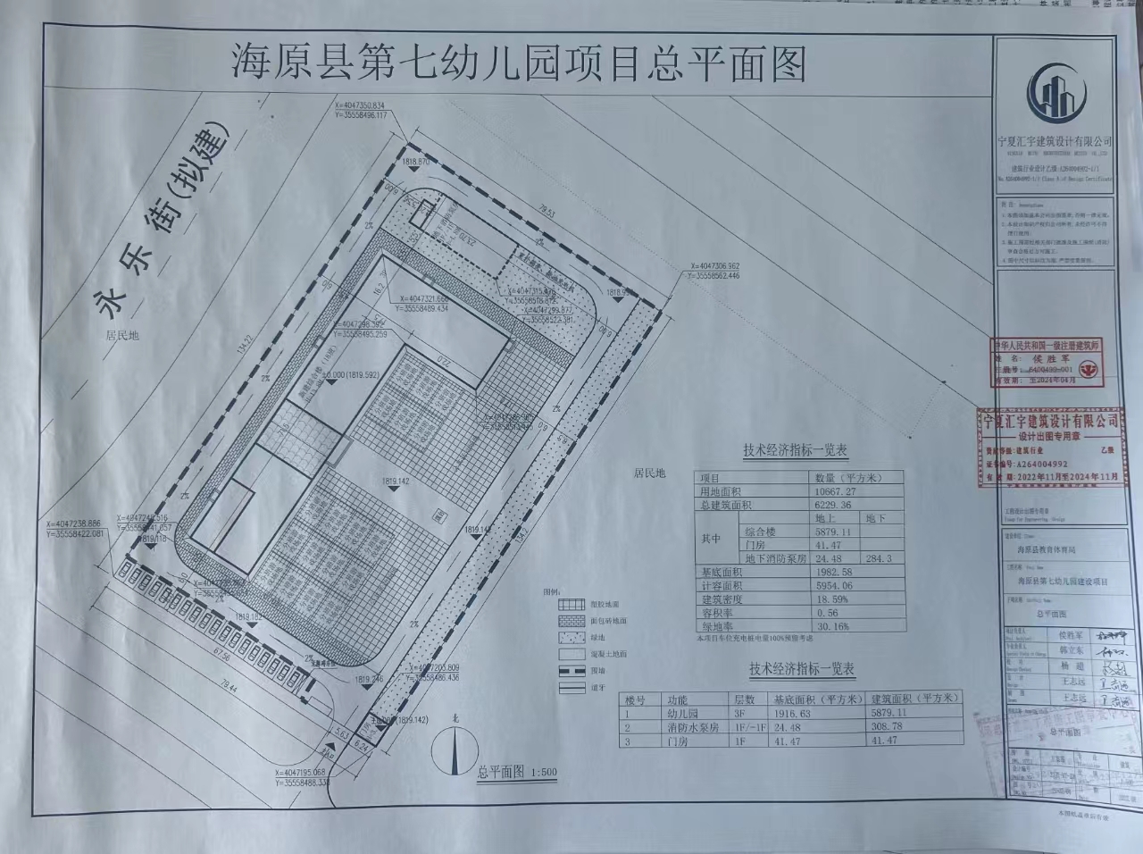 海原县第七幼儿园建设项目,位于海原县城建设路以南、永乐街以东、文萃路以北。项目总占地面积10666平方米,建设内容为:总建筑面积6229.36㎡,其中:综合楼5879.11㎡,门房41.47㎡,消防水泵房地上24.48㎡,地下284.3㎡,及室外附属工程.该项目经审批于2024年3月5日核发了建设用地规划许可证和建设工程规划许可证。