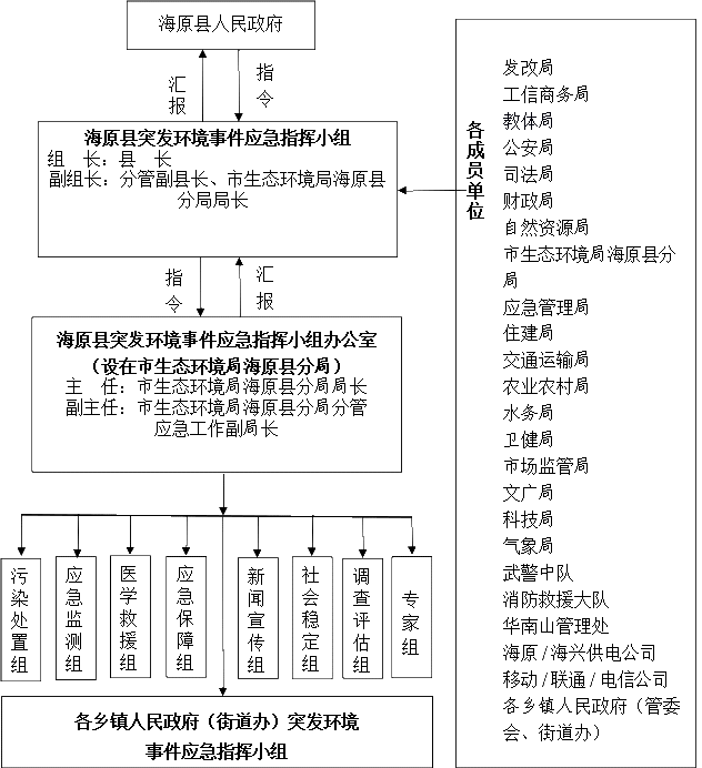 海原县人民政府负责全县突发环境事件应对工作的组织领导,成立海原县突发环境事件应急指挥小组(以下简称“海原县环境应急指挥小组”),在县委、县人民政府安排部署下,负责指导、协调县行政区域内或发生在县外对本县有影响的突发环境事件及次生、衍生环境事件的应对处置工作。